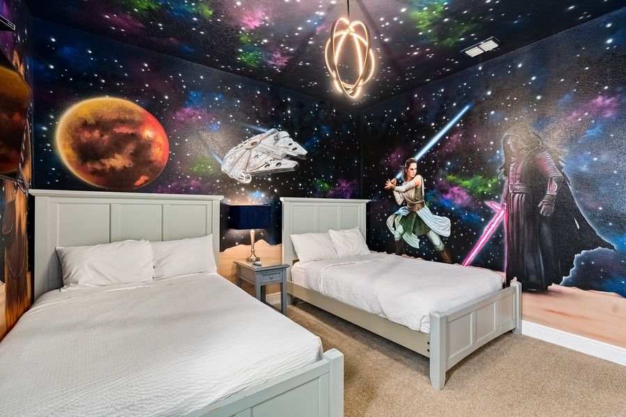 The primary bedroom and a guest room are located on the first floor. Primary guests will enjoy a private en suite bathroom. A second full bath is also located on the first floor. All remaining bedrooms can be found upstairs, each with en suite bathroom access. Younger guests will have their choice of two themed rooms featuring immersive Star Wars and Toy Story wall art. These bedrooms share en suite bathroom access. All eight bedrooms are equipped with TVs for added convenience.