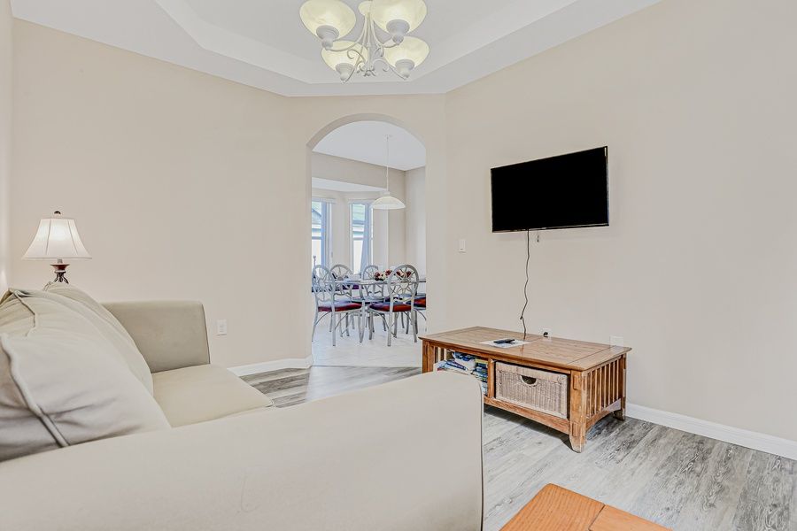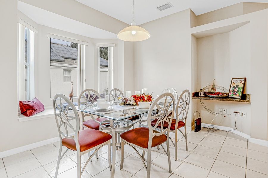 Upon first walking into the vibrant, blue, front door, you'll come into the main living area. Bright and comfortable, this space boasts ample seating and a large TV for your family's viewing pleasure. Grab one of the provided board games and participate in some playful competition. Heading into the kitchen you'll find plenty of space to cook up your favorite meals. Complete with a breakfast bar, and ample counter space, this space is sure to spark joyful conversation and laughter throughout the duration of your stay. In the primary bedroom, you'll discover an en suite bathroom equipped with double sinks, a large soaking tub, and a walk-in shower. The other rooms are subtly decorated with cheerful Mickey Mouse and friends decor, sure to get the kiddos excited for their upcoming park experience!