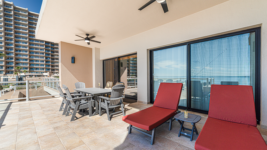 Spacious patio furnished with lounge chairs and a dining table. You can take steps right down to the pools and aqua bar.