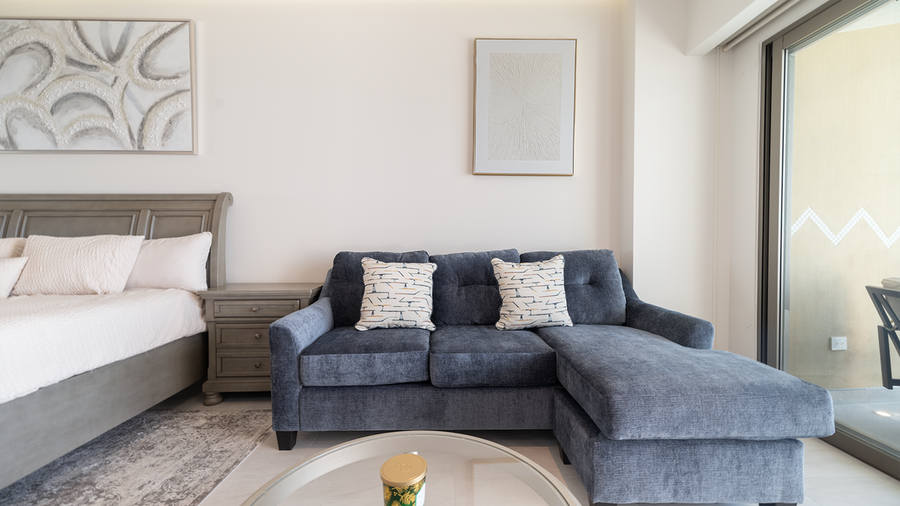 A cozy dining table for two sits beside sliding glass doors that lead to the private balcony. The balcony features a raised table with tall bar stools and an inviting L-shaped outdoor sofa with a coffee table.