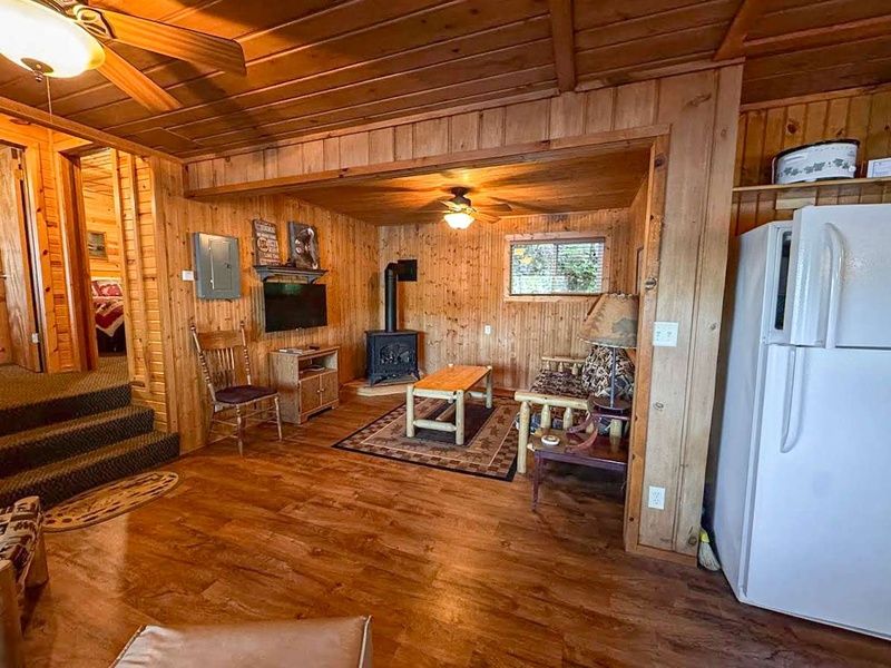 The cabin features three bedrooms and two full bathrooms, including a primary bedroom with an attached bath for added privacy. The living area is warm and welcoming with a gas fireplace, while the fully equipped kitchen includes a dishwasher for easy meals during your stay. A mini-split system provides efficient heating and cooling year-round, and smart TVs with Wi-Fi keep you connected when needed.
