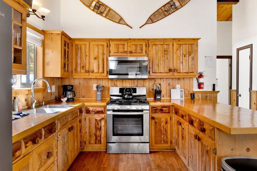 Unwind in the private hot tub under the stars after a day on the slopes, hiking trails, or exploring the village. Inside, you'll find a warm and inviting living space with comfortable seating, a smart TV, and a wood stove to keep things extra cozy during cooler nights.