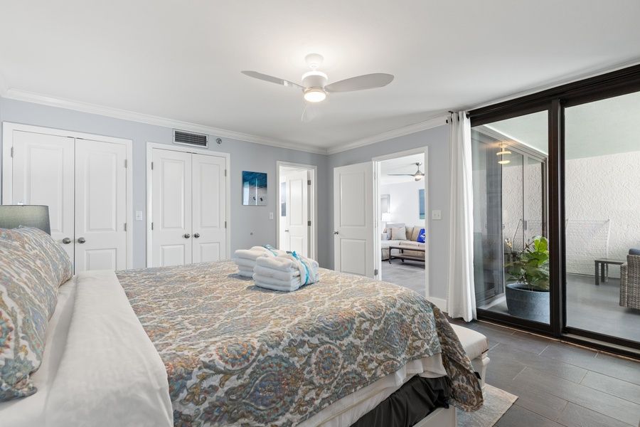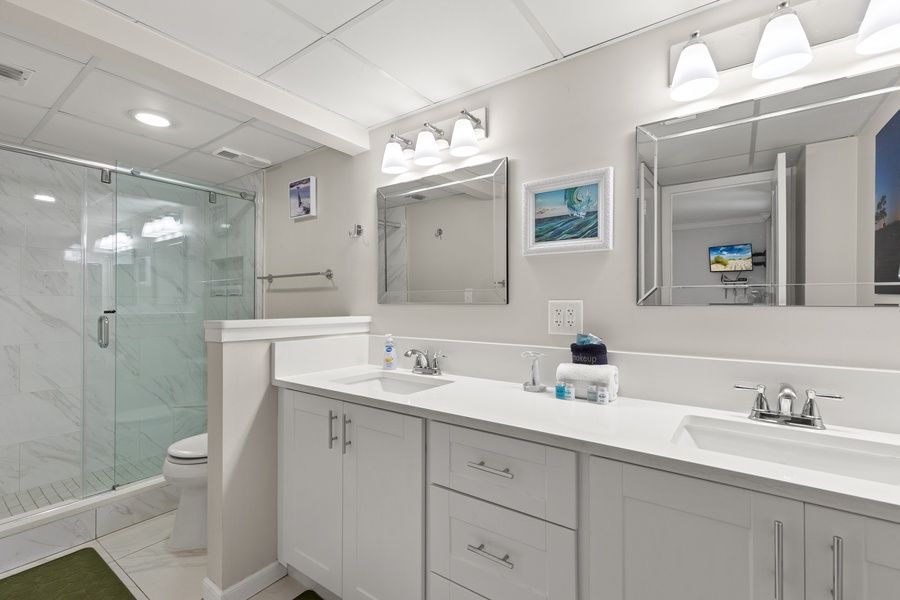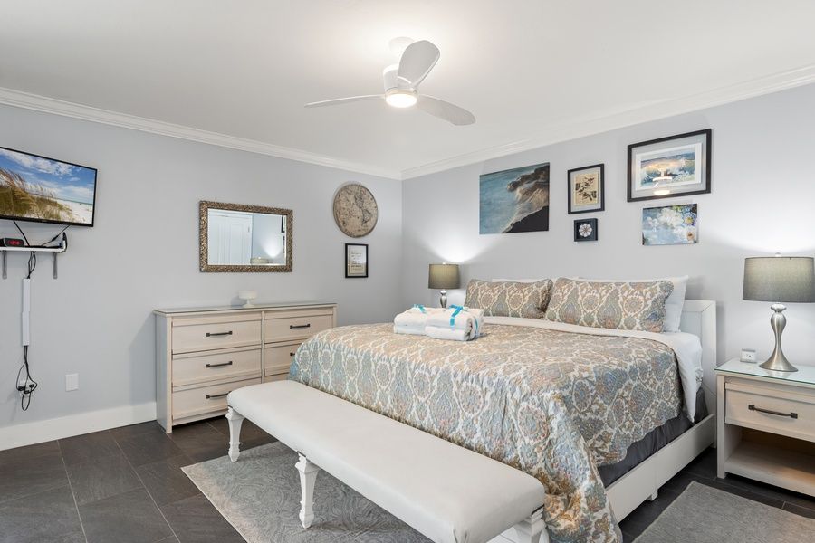 The primary bedroom features a king bed with a private ensuite bathroom, creating a peaceful retreat after a day on the beach. The second bedroom includes two queen beds, offering plenty of space for additional guests, while the sleeper sofa in the living room provides extra sleeping accommodations.