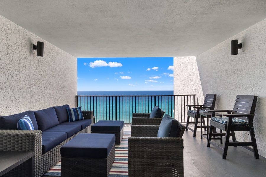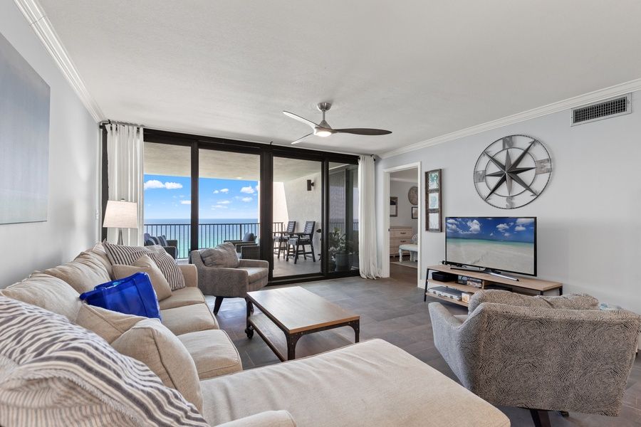 The open living and dining area is bright and welcoming, with sliding glass doors that lead to your private beachfront balcony. Start your mornings with coffee while watching the waves roll in, and end the day enjoying breathtaking sunset views over the Gulf.