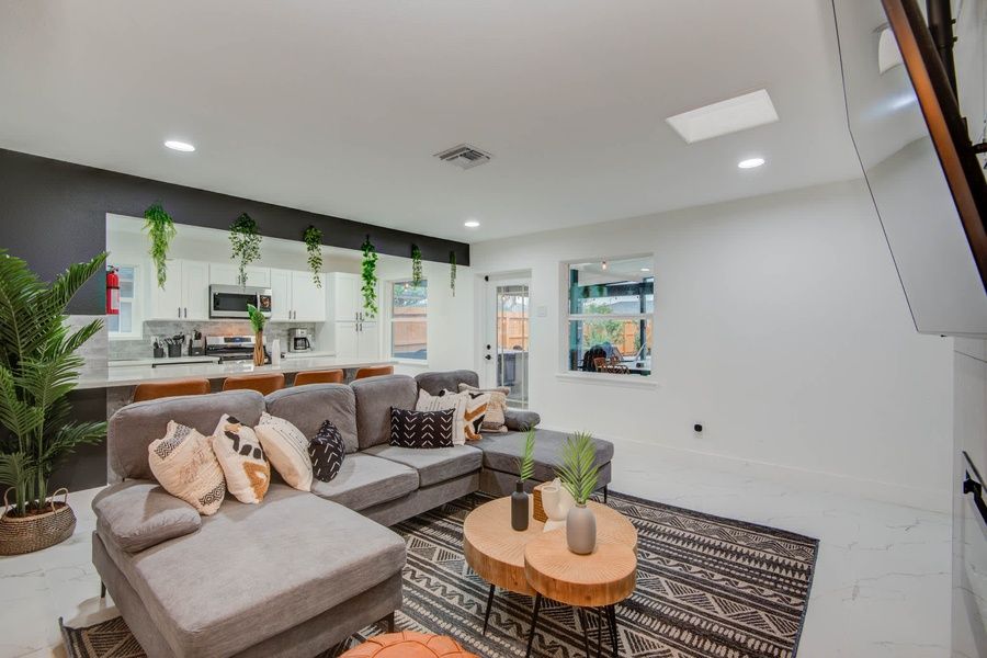 Welcome to your home away from home! Designed to provide an air of modern comfort, this vacation home features a beautiful open-concept layout, a fully equipped dream kitchen, and five bedrooms for plenty of sleeping space! Conveniently located in the much-desired centrally located community of Spring Branch, you’re only minutes to some of Houston’s prime attractions! 5 bedrooms (sleeps up to 14) 2 bathrooms Fully equipped kitchen Outdoor swimming pool Fire pit and hot tub The Space Our home caters to both short-term and medium-term stays, making it an excellent choice for corporate housing needs. Whether you find yourself temporarily displaced from your home or require accommodation for your team during an extended project in our area, we provide a welcoming and comfortable "home away from home" experience. KITCHEN Featuring a bold contrasting center kitchen island that brings as much personality to the space as you do, this fully equipped kitchen has everything you need to whip up a tasty meal! Fully equipped kitchen for all your cooking needs Stainless steel appliances, including fridge, freezer, stove, oven, dishwasher, and microwave All basic cooking essentials included Kitchen island with seating for three DINING With its bold, geometric accent wall, this dining room has been designed to make a statement that’s as memorable as your stay here! Dinner table with seating for 6+ Place settings and dining utensils Breakfast bar seating at kitchen island Restaurant-like environment LIVING ROOM Furnished to provide you with all the comforts of home, this living room invites you to sit back and relax during your stay. Open-concept layout for easy socializing Couch for comfortable seating High-speed Wi-Fi Coffee tables, ottoman, and designer rug BEDROOMS With 5 bedrooms in this vacation home, you’re going to want to check them all out before settling into one! Primary bedroom with a king-sized bed, bedside bench, and matching nightstands 3 additional bedrooms with queen and bunk beds 5th bedroom with a queen-sized bed in the backyard shed BATHROOMS Whether you prefer a bathtub for a warm bath or the convenience of a walk-in shower, both are available to you! 2 private full bathrooms A bathtub for warm bubble baths Glass standing shower for convenience Essential toiletries included (toilet paper, towels, etc.) BACKYARD Bring your swimsuits and enjoy a refreshing dip in the outdoor swimming pool! This fully fenced backyard offers you privacy while the tropical landscaping whisks you away into vacation mode. From the fire pit to the poolside loungers to the outdoor dining area, make the most of your stay here and enjoy all the amenities provided! Fire pit with lounge chairs Outdoor swimming pool Private jacuzzi Furnished patio area Fully fenced for your privacy OTHER AMENITIES Free parking is available to all guests in the garage and on the driveway. If additional space is required, feel free to park on the streets as well. The laundry room is fully equipped with a washer and dryer available for your use should you need to refresh your clothing during your stay. Lastly, we must stress that we do NOT allow parties or large unauthorized gatherings of any sort at our property. We are adamant about only welcoming families and groups who are looking to relax and enjoy the beautiful stunning backyard and the amenities the home has to offer. Other things to note SAFETY DEPOSIT OR DAMAGE WAIVER REQUIRED We understand that accidents can happen. To help protect the space and ensure a worry-free stay, all reservations require either a damage waiver or a safety deposit. You can choose the option that works best for you: a non-refundable damage waiver ranging from USD39 up to USD79, which covers accidental damage and normal wear and tear (no deductible) or a refundable safety deposit of USD450, which will be returned after checkout as long as no damage is found and all house rules are followed. If you’ve already purchased Damage Protection Insurance through a third-party provider, feel free to share your policy with us—we’re happy to review it and we may consider waving the requirement based on your coverage. Please note: The damage waiver does not cover damage caused by house rule violations. GUEST VERIFICATION REQUIRED To help ensure a safe and seamless experience for all guests, guest verification is required prior to confirming your reservation. This simple step is part of our commitment to providing a secure, smooth, and personalized stay for every guest. PET-FRIENDLY STAY Don’t leave your furry friends back home. Take them with you so they can enjoy a perfect vacation! We welcome house-trained pets with a non-refundable pet fee of USD150 per pet (maximum of 2 pets per stay). Please notify us in advance so we can make the necessary arrangements to ensure a comfortable stay for you and your four-legged companions. Goldnest has engaged VacayHome to ensure this listing contains all the information you need and that it is easy for you to book via search engines & online channels. VacayHome is connected directly to the property management system used by Goldnest which ensures that availability & rates are up-to-date & accurate. When you book, VacayHome processes payment on behalf of Goldnest and a charge will appear on your statement as "VacayHome". VacayHome will send you a confirmation e-mail that contains all the information you need to prepare for your vacation including arrival instructions. VacayHome has a 24 x 7 team to assist you with any questions or concerns you may have prior to arrival. To access VacayHome, obtain the customer support telephone number or read FAQs, please click on the links at the bottom of this page.