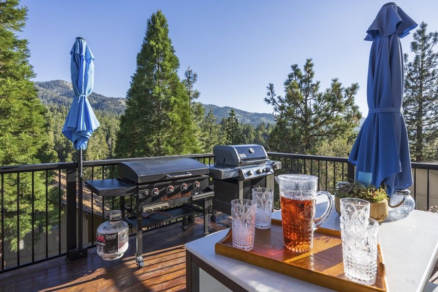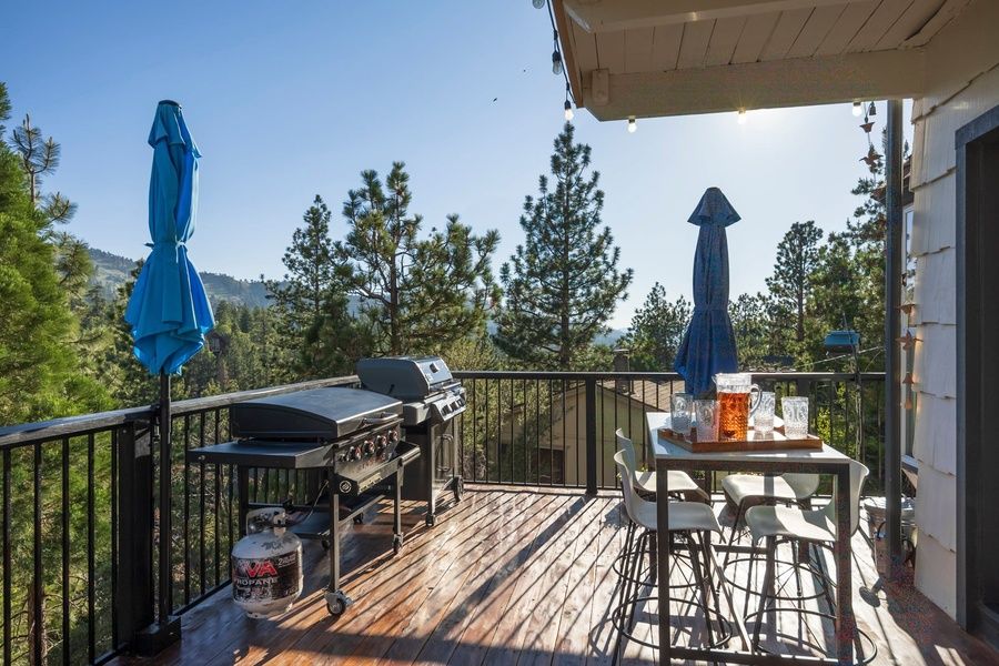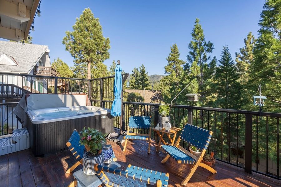 The outdoor space is one of the home's best features. Take in the fresh Big Bear air from the expansive multi-level deck, complete with seating, a BBQ grill, and outdoor dining. Relax in the private hot tub under the trees or gather around the firepit in the evening for a true mountain experience. This home comfortably accommodates families and groups with multiple bedrooms, including a spacious primary suite and additional sleeping areas designed for both comfort and functionality. Clean, well-maintained bathrooms with modern fixtures provide convenience for all guests.