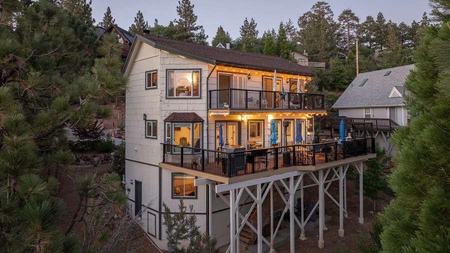 Escape to your perfect Big Bear mountain retreat featuring a private hot tub, expansive deck with forest views, and cozy spaces designed for relaxing, entertaining, and making memories year-round. Whether you're visiting for skiing, lake days, hiking, or a peaceful getaway, this spacious cabin offers the ideal balance of comfort, location, and outdoor experience. Step inside to a warm and inviting living space with vaulted wood-beam ceilings, comfortable seating, and a cozy fireplace perfect for movie nights or unwinding after a day on the slopes. The open layout allows everyone to gather comfortably, while the shuffleboard table adds a fun and interactive touch for guests of all ages.