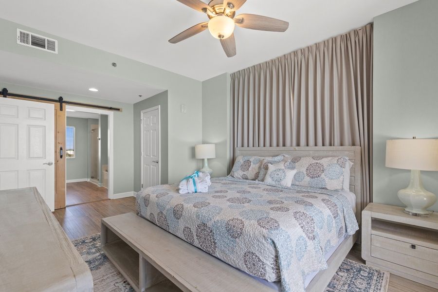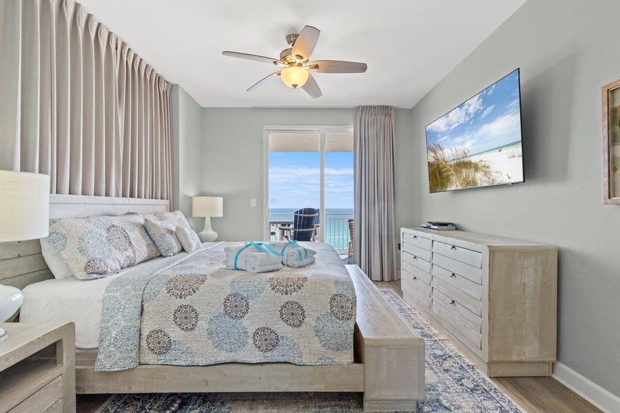 • Bedroom 1: King Bed, Private Ensuite Bathroom and Private Balcony Access