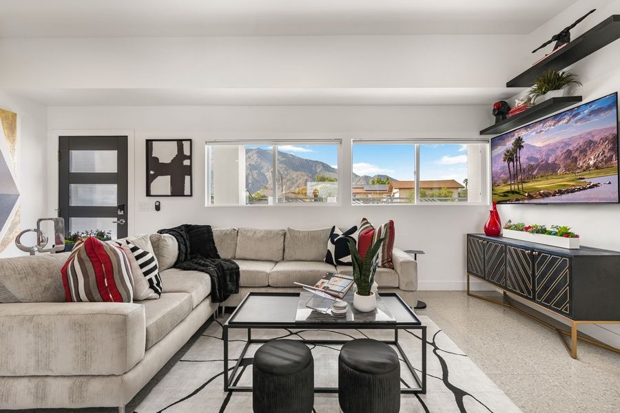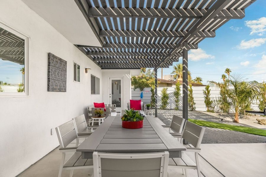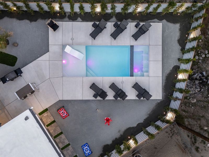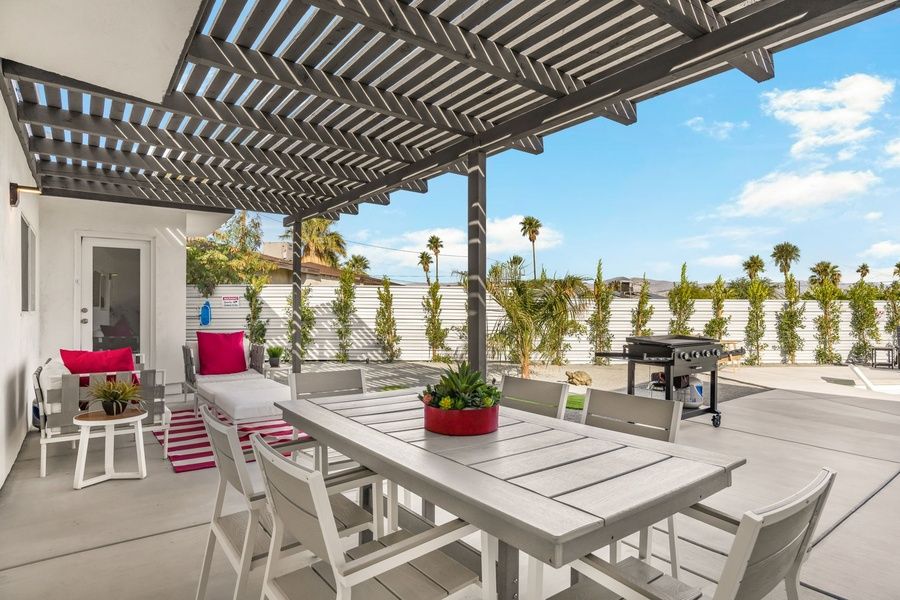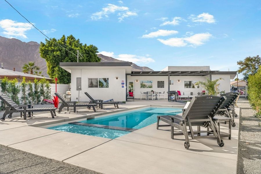 PS CITY ID #018542 Welcome to Sunview Escape, a freshly remodeled retreat that blends modern comfort with a playful, design-forward vibe. Set against a backdrop of stunning mountain views, this 4BD/3BA home is designed for relaxed indoor-outdoor living—perfect for families and small groups looking to unwind in style. Just minutes from downtown, the Aerial Tramway, and top local attractions, this home offers both convenience and privacy, with a gated entry and thoughtfully curated spaces. Highlights • Freshly remodeled with a fun, modern Palm Springs aesthetic • Private backyard with pool, spa, and mountain views • Game room with arcade, shuffleboard, and board games • Family-friendly amenities including pack & play and high chair • Gated property with indoor-outdoor living design • Close to downtown Palm Springs, tramway, and top attractions The Space Sunview Escape is a thoughtfully updated Palm Springs retreat designed for comfort, style, and connection. The home features an open-concept layout that seamlessly blends the living room, kitchen, and dining area—ideal for gathering and entertaining. The kitchen is fully equipped with stainless steel appliances and everything needed for cooking at home, along with a coffee setup and complimentary coffee and tea. The interior design balances a clean, modern look with playful pops of personality, creating a relaxed desert vibe throughout. The home is also equipped with Smart TVs, blackout shades, and convenient touches to ensure a comfortable stay. Sleeping Arrangements This home accommodates up to 8 guests (per city regulations: 6 adults max, plus 2 children under 13). • Primary Suite: King bed with ensuite bathroom and walk-in closet • Second Suite: King bed with ensuite bathroom • Bedroom Three: Queen bed with workspace • Bonus Room: Queen bed The primary suite includes family-friendly amenities such as a pack & play and high chair. All bedrooms feature Smart TVs, blackout shades, and added comfort essentials. Outdoor Living The private backyard is designed for enjoying the Palm Springs lifestyle, with beautiful mountain views and multiple areas to relax and entertain. • Private pool with in-water loungers • Spa/hot tub • Outdoor dining area • Propane BBQ grill • Cornhole and open yard space Whether you're starting your day with coffee outside or ending it with a swim under the stars, the outdoor space offers a true desert escape. Pool Ensure a comfortable swim with optional pool heating, available upon request at booking or before your arrival. The pool is heated to 87º from 7 AM to 7 PM throughout your stay. Rates vary by season: • November–March: USD75/night • April, May, October: USD50/night • Not needed in other months For stays under 7 nights, pool heat must be purchased for the entire stay—we cannot heat it for select days. A 24-hour notice prior to your arrival is required to ensure optimal warmth on your first night. Heating begins the day before your arrival at no extra charge. Hot Tub Indulge in the ultimate relaxation with our hot tub, conveniently heated at your fingertips using a remote control. Please note that the hot tub is not pre-heated before arrival, but worry not—there's no extra charge (even if not opting for pool heat) to enjoy its warmth. Simply activate it whenever you desire, creating the perfect atmosphere for a soothing soak during your stay. Location Located in Palm Springs, this home offers convenient access to many of the area's top attractions: • Downtown Palm Springs shopping, dining, and nightlife • Palm Springs Aerial Tramway • Palm Springs Art Museum • Indian Canyons hiking trails • Joshua Tree National Park (South Entrance) Summer Utility Surcharge For stays of 29 nights or longer between June 1st and September 31st, a USD750/month utility surcharge will apply to help cover the additional energy costs associated with cooling the home during the summer heat. Dog Fees (1 dog max) Regardless of what you may see in the amenities or platform wording, we define pets as dogs only—no other animals are permitted at our homes. There is a USD199/dog/stay fee. Simply include the number of dogs that will be joining you and the fee is automatically included in your rate. We ask that you pick up after your dog if they relieve themselves in the yard. Signs of extensive pet damage, could result in additional fees. Any signs of pets on the property without our knowledge will incur an additional USD500 fee. To clarify, cats are not allowed. Additional Policies & Rules • No outdoor music. Doors must be closed if playing music within the house. • 100% quiet hours outside from 10pm-10am • No smoking inside home • Renter must be 25+ years of age • Guests will sign a Ryson "Terms and Conditions" form and City Ordinances require a copy of your ID to Ryson prior to the day of your arrival. Ryson Vacations has engaged VacayHome to ensure this listing contains all the information you need and that it is easy for you to book via search engines & online channels. VacayHome is connected directly to the property management system used by Ryson Vacations which ensures that availability & rates are up-to-date & accurate. When you book, VacayHome processes payment on behalf of Ryson Vacations and a charge will appear on your statement as "VacayHome". VacayHome will send you a confirmation e-mail that contains all the information you need to prepare for your vacation including arrival instructions. VacayHome has a 24 x 7 team to assist you with any questions or concerns you may have prior to arrival. To access VacayHome, obtain the customer support telephone number or read FAQs, please click on the links at the bottom of this page.