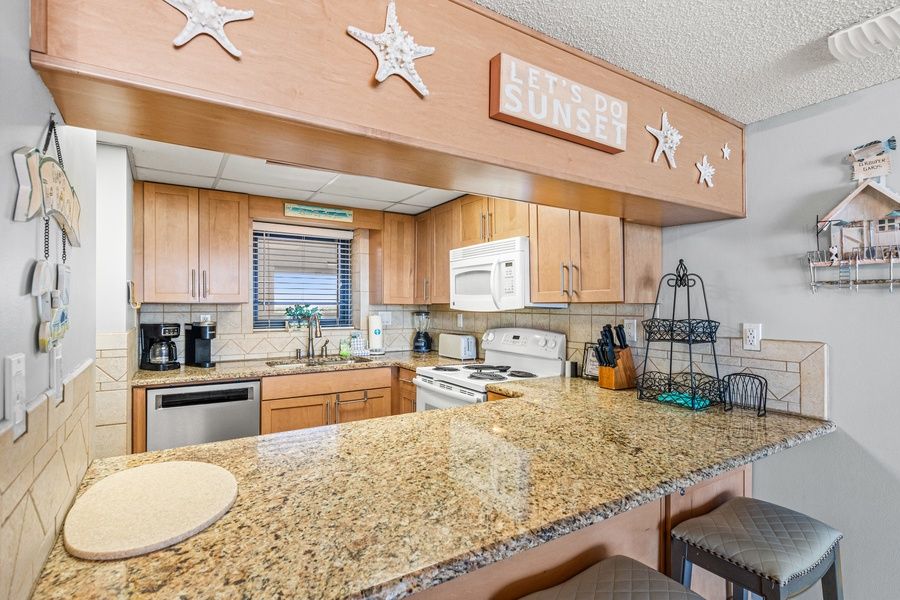 This Gulf-front condo features a private balcony with sweeping views of the water, where you can unwind and take in unforgettable sunsets. Inside, you’ll find a spacious and comfortable living area, along with a fully equipped kitchen for everything from quick breakfasts to family dinners.