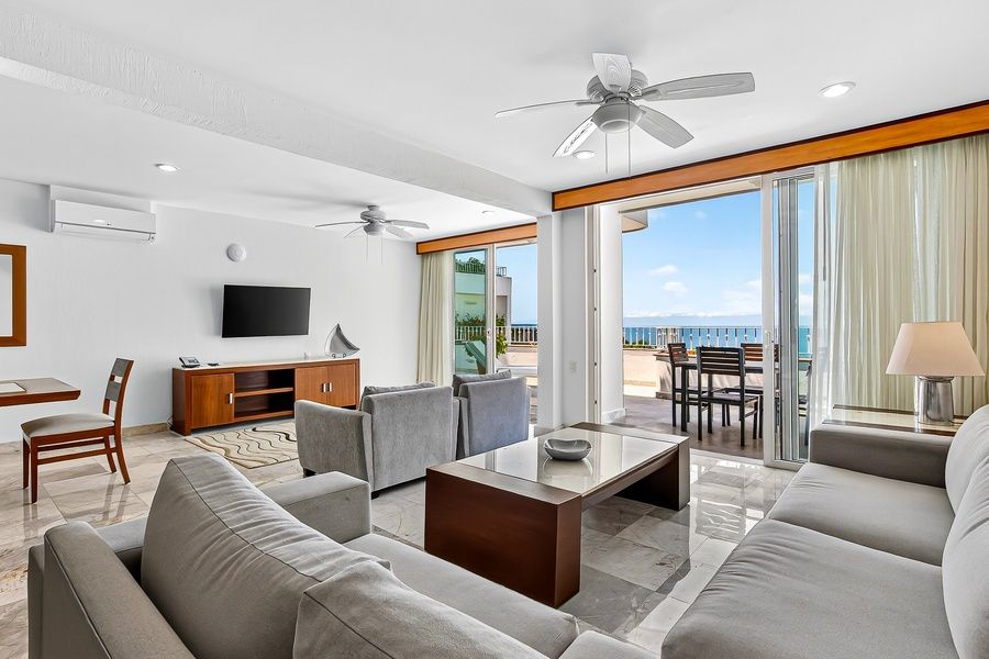 Welcome to your luxurious getaway in Puerto Vallarta, where comfort meets breathtaking views! This stunning three-bedroom suite is designed to accommodate up to eight guests, making it perfect for families or groups of friends. The master bedroom features a plush king-size bed, while the second bedroom offers a cozy queen-size bed, and the third bedroom is equipped with two full-size beds. Each room is thoughtfully furnished to ensure a restful night's sleep.