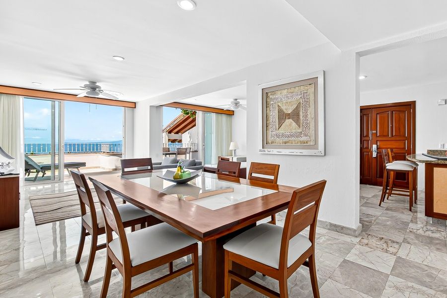 Step into the spacious living area, where you'll find comfortable seating for relaxation and entertainment. The living room seamlessly opens to a terrace that boasts panoramic views of the stunning Banderas Bay, providing the perfect backdrop for your morning coffee or evening cocktails. The fully equipped kitchen includes a breakfast bar and pantry, making meal preparation a breeze. Gather around the dining table that seats eight for memorable meals together.