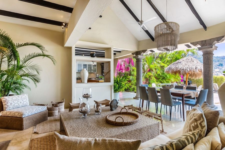 Inside the home, you'll find Serrana-style architecture, which incorporates contemporary materials and construction systems with a rustic and traditional look, resulting in a thoroughly modern yet colonial feeling. Sloping clay-tile roofs, exposed brick walls, domes, arches, narrow, vertical windows with balconies, plus the use of wood for beams, doors, and shutters all lend the villa a truly spectacular atmosphere. The main living space is fully open to the outside, and the living room looks out over the mountains, coastline, your private pool, and lush landscaping. Several comfortable seating areas offer TVs as well, but you'll be too distracted by the view. With your in-home chef preparing one meal a day, you won't have to worry much about cooking, but if you do want to make a snack, the full, spacious kitchen offers plenty of room.