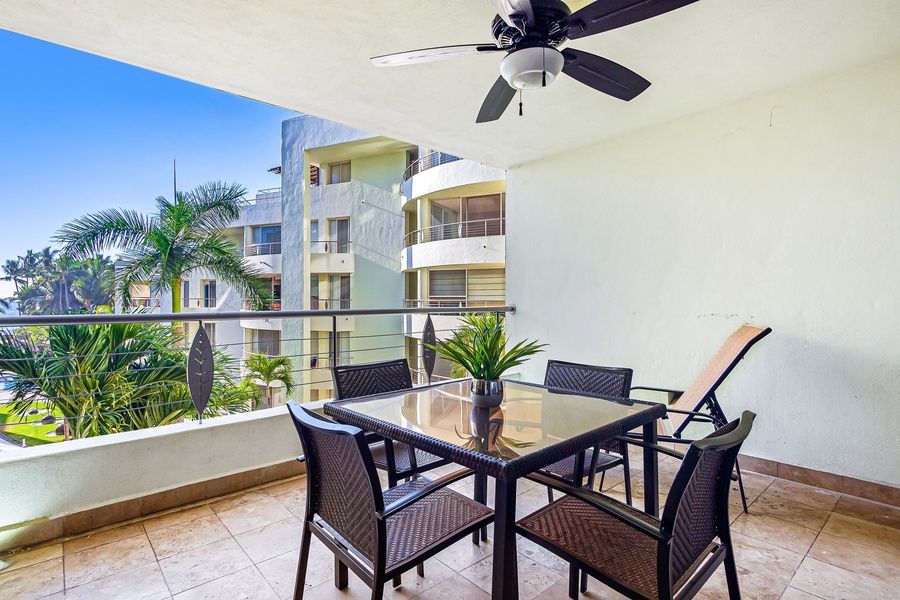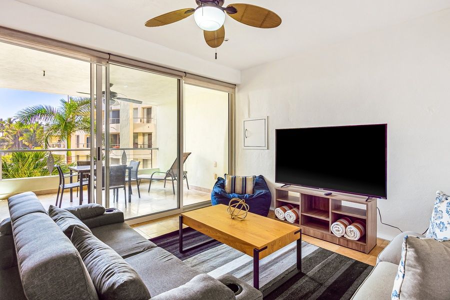 Inside your hideaway, discover ocean views, spacious living quarters, and modern amenities. The main living room is adorned with plush furnishings and boasts a large TV. Relax here, or step out onto the roomy balcony where the green of the palms frames the blue of the ocean.