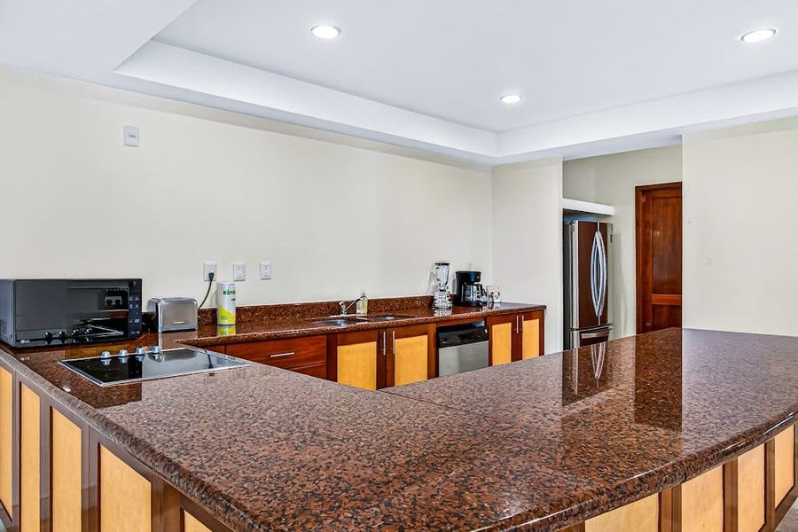 This elegantly appointed suite features modern décor with rich marble and wood detailing, ensuring a comfortable and stylish stay. With a king bed and a double bed, it's perfect for families or couples seeking a romantic getaway. Enjoy the convenience of a fully equipped kitchen, complete with a fridge, stove, oven, and coffee maker, allowing you to prepare meals at your leisure. For entertainment, indulge in Netflix streaming on the flat-screen TV or challenge your loved ones to a game of ping-pong.