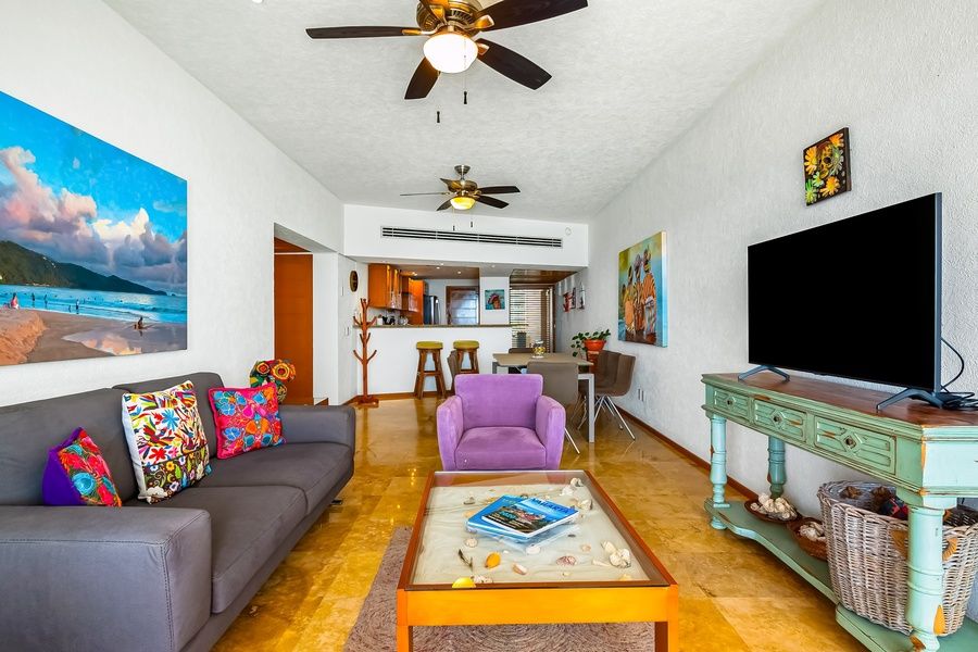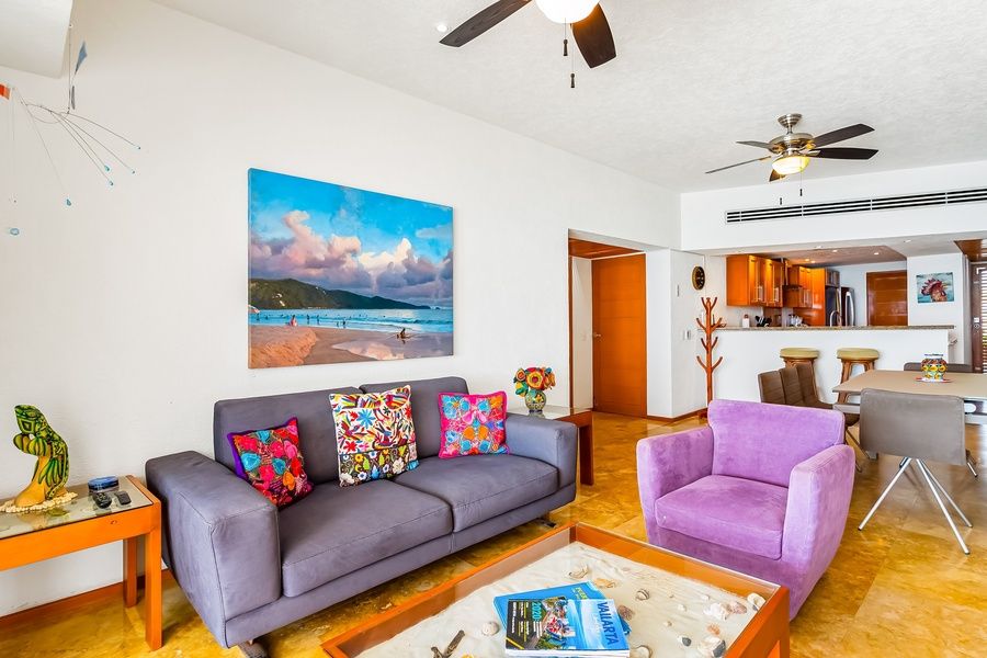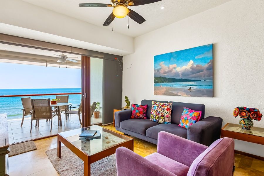This colorful home away from home presents you with the perfect home base for your next adventures. Upon entering, find a bright, airy, open floor plan with a spacious beachfront balcony featuring an outdoor dining area and inviting seats. Dine alfresco with a view you won't forget any time soon! Spread out comfortably in the living room, furnished with comfy sofas and a TV for your entertainment. When mealtime comes, don't hesitate to try your hand at a local Mexican recipe and surprise your guests with a delicious treat! Additional perks include an on-site washer/dryer and central air-conditioning.