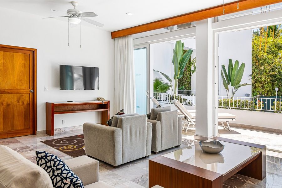 Welcome to your luxurious retreat in Puerto Vallarta, where comfort meets breathtaking ocean views. This stunning suite features two beautifully appointed bedrooms, ensuring privacy and relaxation for all guests. The master bedroom boasts a king-size bed and a 32-inch LCD screen, while the second bedroom is equipped with two double beds and another 32-inch LCD screen. Both bedrooms have their own full bathrooms and open onto private terraces with spectacular views of the bay. The open-concept living area seamlessly connects to a spacious terrace, perfect for enjoying the gentle ocean breeze. Gather around the dining table for six, or unwind in the cozy living room equipped with a 42-inch LCD TV and cable channels. With amenities like wireless internet access, air conditioning, and a kitchenette, you'll have everything you need for a comfortable stay. Step outside to discover the resort-style amenities, including a heated infinity pool, hot tub, and outdoor dining area. Enjoy the convenience of on-site parking and easy access to the beach, where you can indulge in activities like fishing and whale watching. Whether you're seeking a romantic getaway or a family-friendly vacation, this suite in Puerto Vallarta is the perfect destination for relaxation and adventure. Book your stay today and experience the beauty of the Mexican coast! THINGS TO KNOW - Smoking is prohibited on the property. Failure to comply with this rule will result in a fine payable on site.