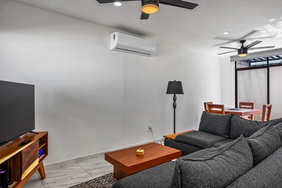 All three bedrooms can be found upstairs. The main suite boasts a partial AC unit, a private balcony with seating, and an en suite bathroom. The other two bedrooms share a full bathroom. Additional perks include a washer/dryer and free WiFi.