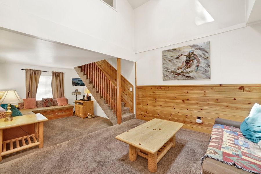 Climb the entrance stairs where you will then enter your home into a nice sitting area offering couches, a flat screen TV with Cable, and complimentary hi speed WIFI so you can relax and snuggle up as you pop on a movie together and watch the snow falling outside. You will love the cozy living and dining room area around the corner, with an added couch for seating and cute dining table for meals, there is plenty of room to make memories together for your group here.