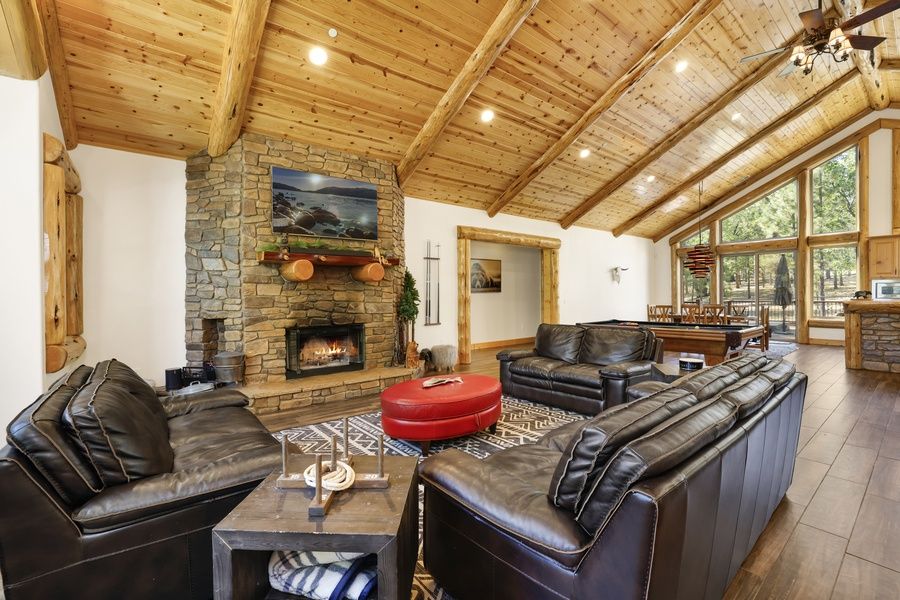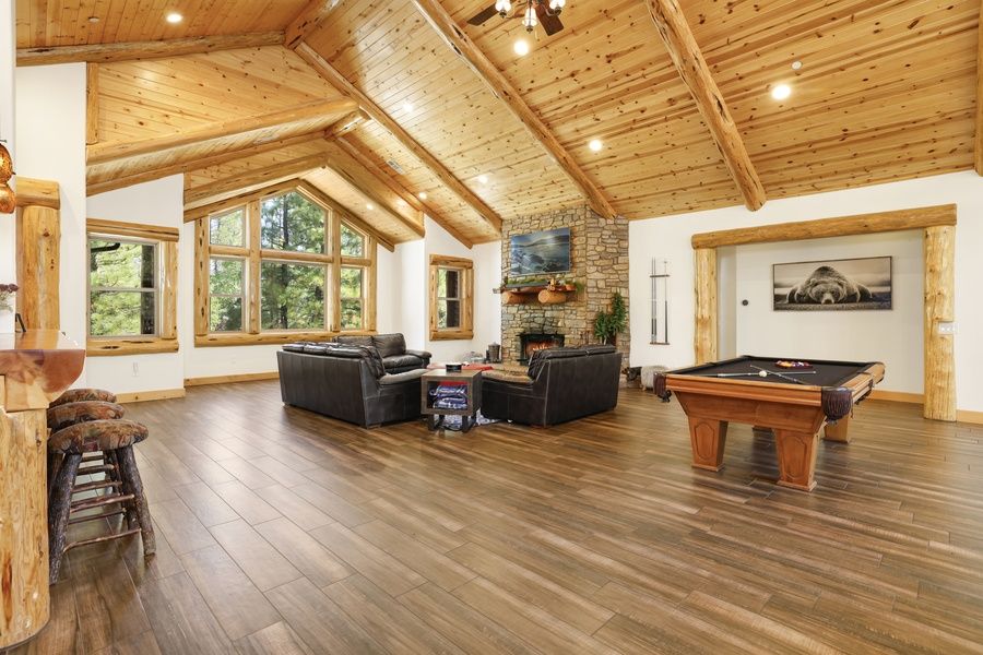 This spacious cabin features soaring knotty pine ceilings, a cozy great room with a 65" TV and fireplace, a billiards table, and a built-in wet bar—ideal for entertaining. The gourmet kitchen comes fully equipped with stainless steel appliances, granite counters, and a beautiful log dining table.
