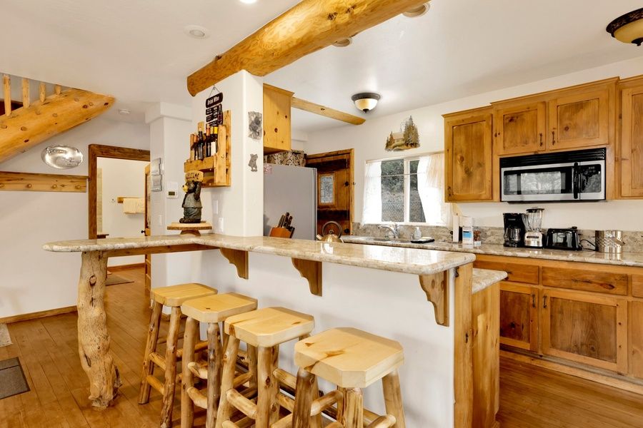 After climbing the two flights of stairs from the driveway to the door you will enter your chalet in a warm and cozy living room area boasting all that you need for a memorable visit including hardwood floors and central forced heat to keep your group warm and cozy no matter the season. Comfy leather couches are sat perfectly around the toasty wood burning fireplace providing a great spot for you to enjoy making memories together. The mounted flat screen TV offers Cable and Complimentary WIFI is provided for you by the owners. A custom log dining table and breakfast bar provide ample sitting areas for your group to gather together for meals or entertain a small dinner party. The chef of your group will absolutely love the freshly remodeled kitchen boasting custom pine cabinets stocked full with utensils, cookware, and ample granite counter tops for you to prepare your meals. New stainless steel appliances and a dishwasher ensure that your meals here are a breeze!