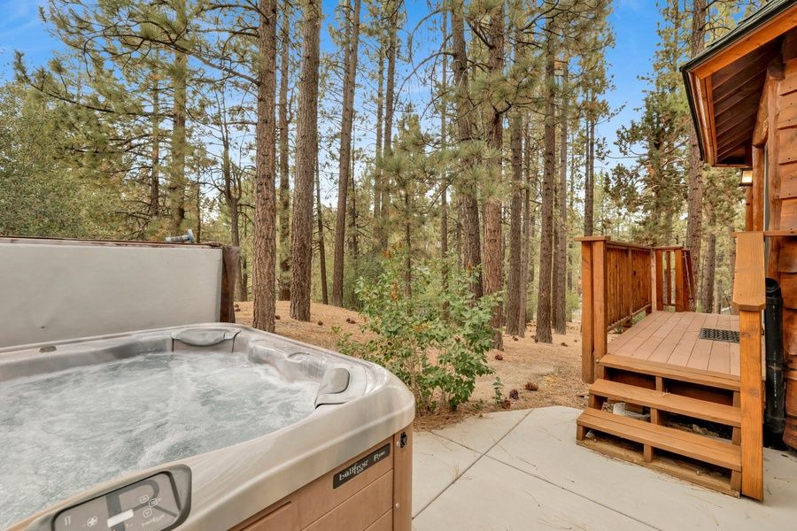 The separate laundry room offers a washer and dryer for those wet snow clothes or long term stays for your added convenience while a guest bedroom and bathroom both easily accessible here on the main level. Upstairs you will find two additional sleeping quarters and another guest bathroom for your group, all are made up for your visit with warm linens, blankets, and fresh shower towel when you arrive for your vacation stay. This fabulous and secluded home is on a spacious and private fenced 3 lot property with a freshly installed patio area and new hot tub for you to take in this true mountain experience, offering privacy and plenty of space among the trees. Enjoy soaking up your day in the spa or grilling up dinner on the Propane BBQ. The outdoor patio furnishings and multiple sun decks make for many great spaces for you to relax or enjoy your first cup of coffee among the birds in the mornings. Book your stay today so your group can enjoy the experience of a lifetime "Living Log Cabin" here in beautiful Big Bear!