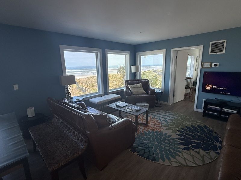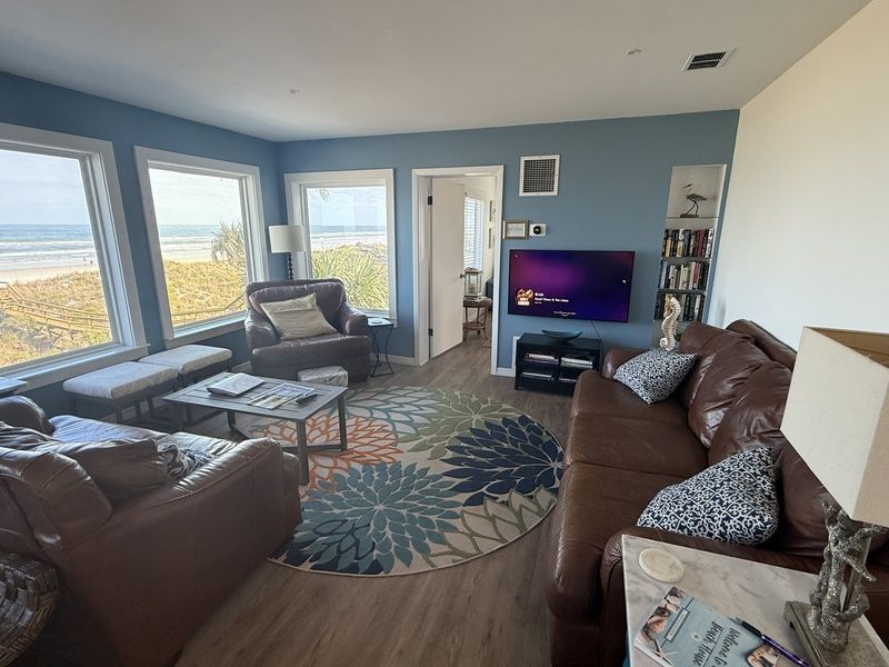 This home is beautifully furnished and you feel at home as soon as you enter. The living room has two leather couches and chair so there is plenty of room for the whole family. It is nicely decorated with a 46” flat screen TV and WIFI throughout the house. Next you can exit through the sliding glass doors to the ocean front deck with plenty of seating for the family.