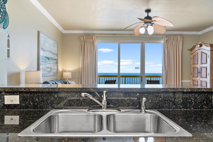Gulf Vistas welcomes you with open arms as your first glance includes the floor-to-ceiling patio doors that take you onto the expansive balcony with ample outdoor seating and amazing views of the emerald green waters and shimmering white sands. The living area features high-end luxury furnishings including a queen sofa sleeper, flat-screen HDTV, and breathtaking views. Formal dining seating for four and added breakfast bar seating allowing everyone to dine together. The fully equipped kitchen features stainless steel appliances, granite countertops, and everything you'll need to create sumptuous coastal cuisine for the entire family.