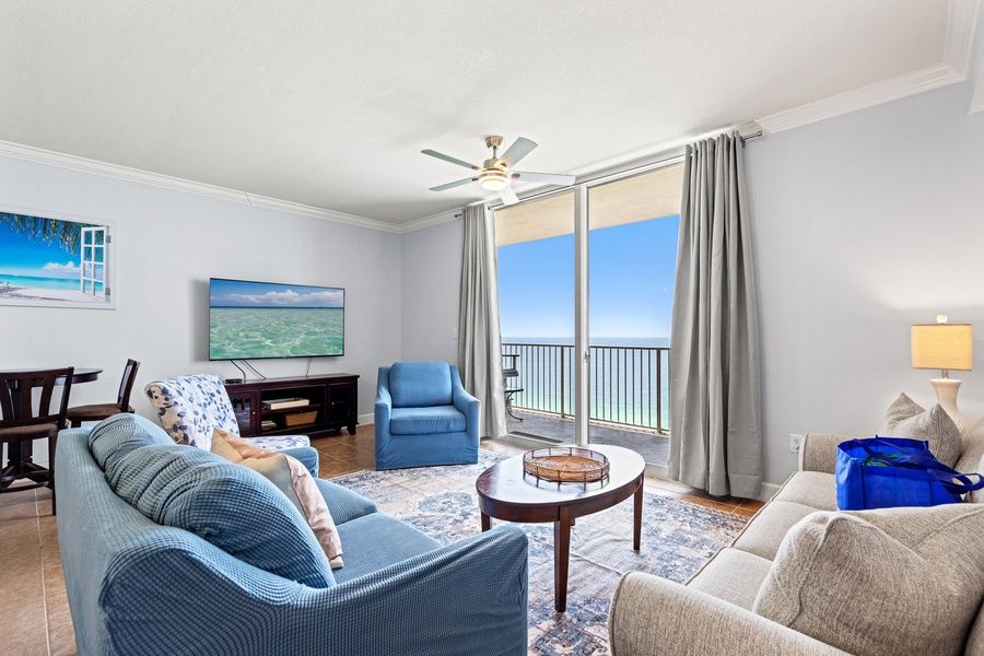 Step inside and be greeted by panoramic Gulf views that stretch across the horizon, visible from your expansive private balcony — the perfect spot for morning coffee with dolphins playing offshore or catching vibrant Panhandle sunsets each evening.