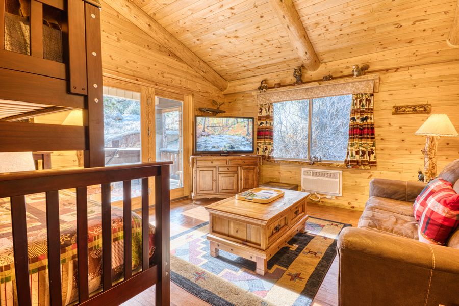 The Sunrise Cabin is located across the street from Pine Haven. You must be able to walk up a flight of stairs. The Sunrise Cabin is a wonderful spacious 3 bedroom (1 king, 2 queen) 2 bath home, that offers great extras: a gas grill, wireless high speed internet, 50" TV. leather sofas, a fully equipped kitchen with dishwasher and microwave oven, granite counter tops, stainless steel appliances and a washer and dryer.