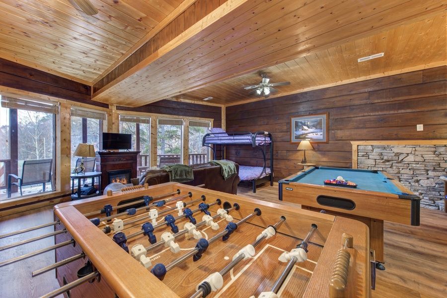 The open stairway also leads to the lower level where you will find a family room with a pool table, a foosball table, and two queen size sleeper sofas. Off the family room is the second bedroom with a king size bed. Adjacent to the bedroom is the 3rd full-size bathroom with a washer and dryer for your convenience.