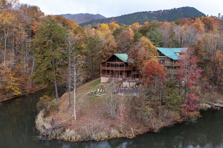 Bring your sweetheart, family and friends to this beautiful 3 level log cabin with a lake shore on three sides and an amazing mountain view. On a clear day you can see up to 3 mountain ranges. With 2 bedrooms, 4 bathrooms, and three queen size sleeper sofas the cabin is suitable for 6 adults and 6 children.. When you enter Down By The Water! through the French doors you will find a comfortable living room with a gas fireplace, a complete kitchen and spacious dining room. There is also a queen size sleeper sofa in the living room. Off the living room is the master bedroom with a king size bed, TV, fireplace and diamond shape recessed whirlpool tub next to a full-size bathroom for your convenience.