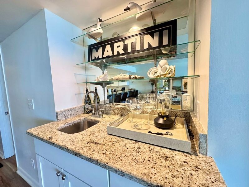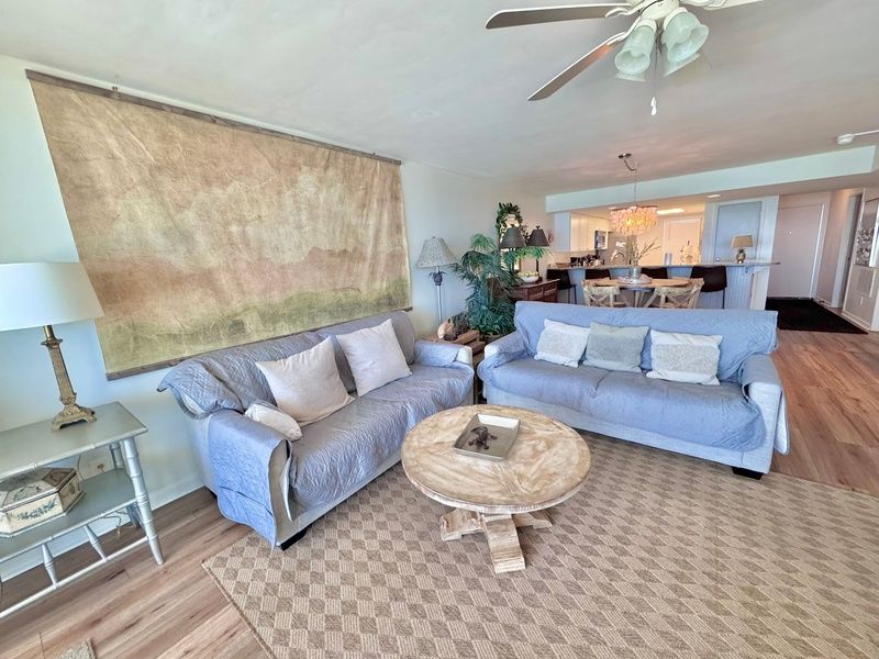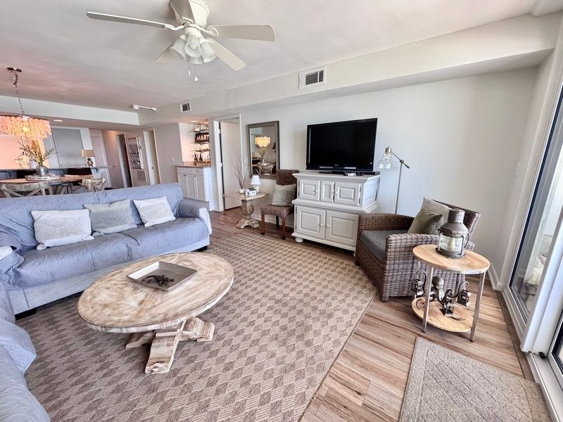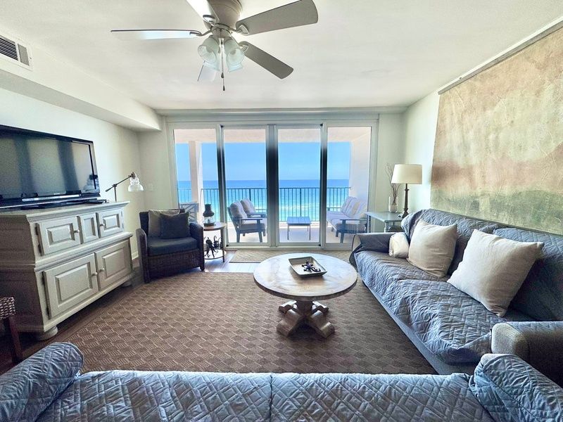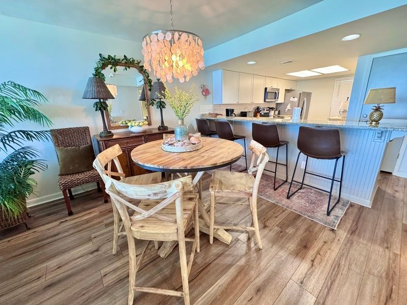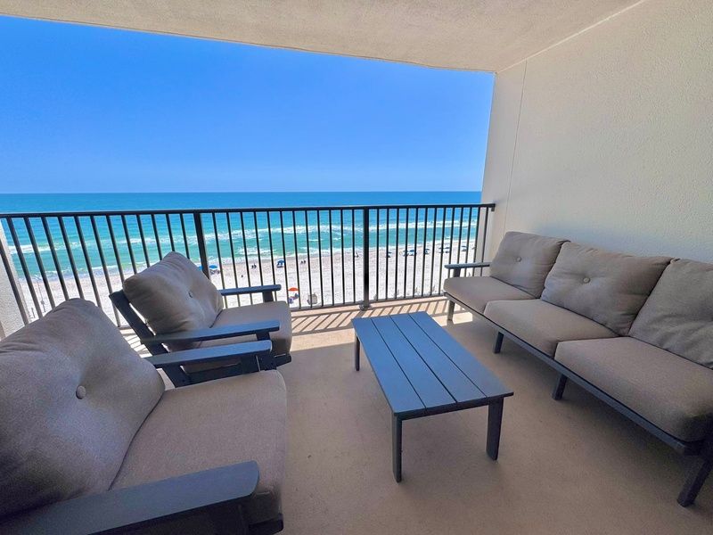 Our two bedroom/two bath, top floor, Gulf front condo is a perfect spot for your family vacation. This is an extra spacious, top floor unit is furnished with top of the line furniture and professionally decorated. Our larger than average private balcony is a great spot to hang out and enjoy the gorgeous views of the Gulf of Mexico. This unit sleeps six. This newly renovated condo has a fully equipped kitchen, a gorgeous dining room, wet bar, and den. The kitchen is well stocked and very spacious. We have a comfortable dining table and eat-in-bar with comfortable stools. Our beautifully custom furnished bedrooms are spacious with inviting comfortable beds. We have a great King bed in the master, two twin beds in the guest bedroom. For your convenience, we also offer a pack-n-play, high chair, and booster seat. We provide TVs in all bedrooms and high speed Internet access so you can stay connected!!