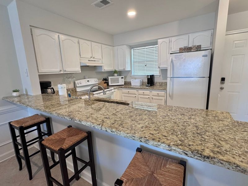 This unit is impeccably maintained, reflecting the pride and care of its owners from the moment you walk through the door. Inside, you'll find two bedrooms and two bathrooms. The master bedroom boasts a comfortable king-sized bed and an en-suite bathroom, providing a relaxing and private retreat. The second bedroom is furnished with two full-sized beds, offering ample space for family and guests. In the living room, a sleeper sofa accommodates additional guests. The kitchen is fully stocked with pots, pans, silverware, and cooking utensils, ready for you to cook up your daily catch. Step out onto the balcony from the living room to enjoy your morning coffee or evening drink while taking in the breathtaking bay views.