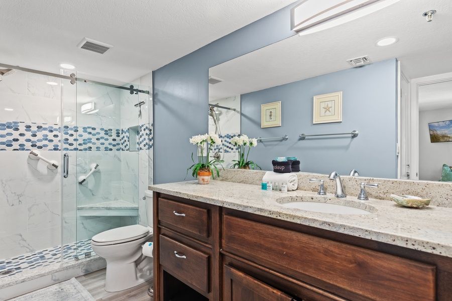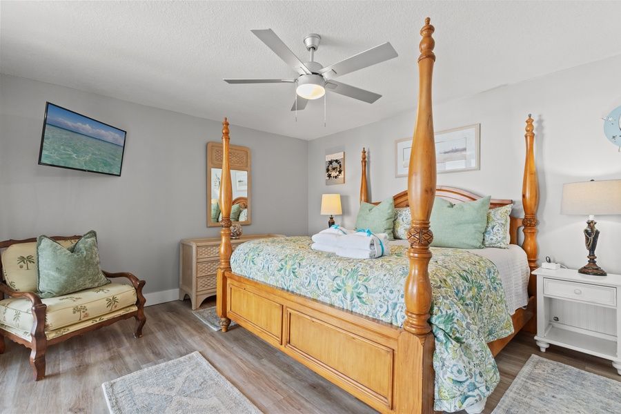 Retreat to the master bedroom featuring a luxurious king bed and an ensuite bathroom for added comfort and privacy. The second bedroom offers a queen bed and a twin over twin bunk bed, ideal for families or friends traveling together.
