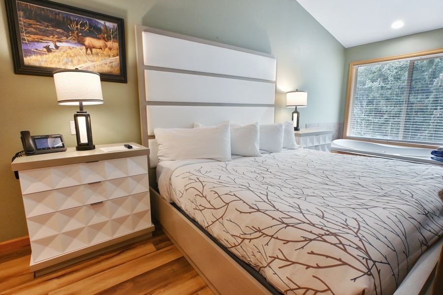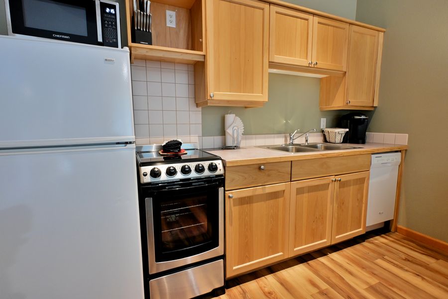 Seek comfort and relaxation in this suite, fitted with a Queen Bed, full kitchen, and a luxurious jetted tub. Please note you must be able to climb stairs to get to this unit.