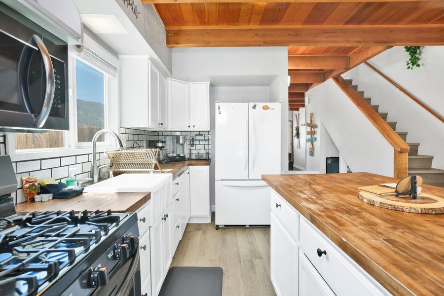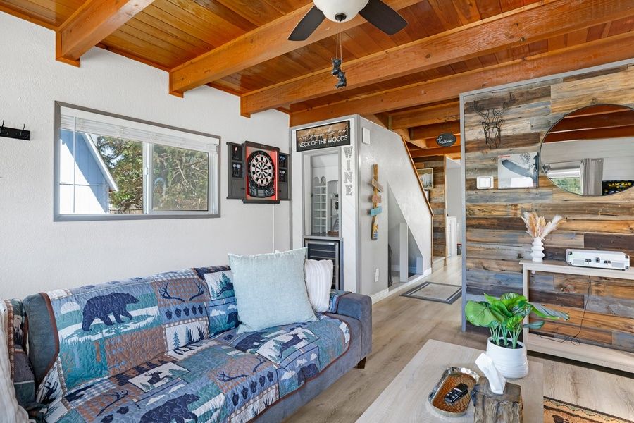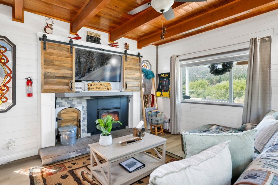 Head upstairs to access two oversized sleeping quarters including a guest room and the spacious primary suite which offers a private balcony and full bathroom along with reclaimed wood accents, plenty of storage space, and fresh bedding. Your chalet is made up for your arrival with warm linens, blankets, pillows, and fresh bath towels for your group's visit when you arrive. Head out back to the great fenced yard to enjoy patio furnishings and a propane BBQ where you can grill up your freshly caught dinner from the lake as you unwind in the evenings. Soak your muscles in the private hot tub as you recover from your adventurous day out on the lake or mountains and catch some shooting stars. Jay Bird Landing Escape lives up to it's name providing guests with all that they need to relax and vacation in style and comfort together- come experience your new home away from home in the mountains today!