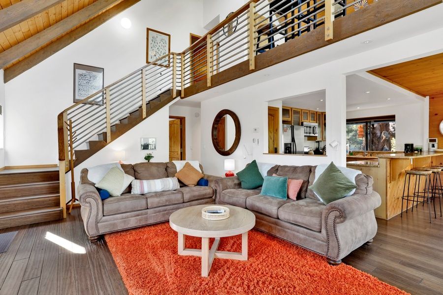 You will love taking in the beautiful mountain views from the adorable loft upstairs, complete with comfortable sitting chairs and an entertaining foosball table for added fun. Your home provides the perfect amount of space with two bedrooms on each level each with a Streaming TV, warm linens, blankets, and pillows when you arrive. Your group will love the modern showers and infrared heat lamps providing you with year round comfort plus fresh shower towels are provided. Head outside to find the most relaxing and serene alpine environment for you to unwind and take in the nature of Big Bear. The owners have supplied added outdoor furnishings and fun for your vacation experience including a propane BBQ to grill out and relax in the evenings. Head over to your own private hot tub out back where you can enjoy soaking up your fun day of adventure out on the lake or mountain in your own private hot tub under a million stars! Chimney Peak truly has it all, pairing the best of Big Bear with the ultimate comforts from home and added amenities to enhance your vacation, you will want to return year after year!