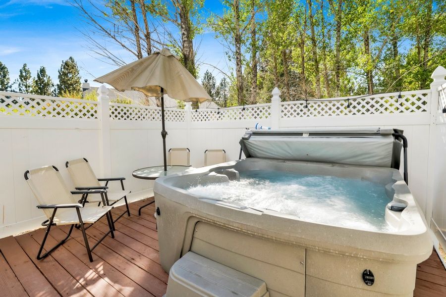 As you step inside, this beautiful single story home, you'll be greeted by a spacious and inviting living room, bathed in natural light from large windows that frame the surrounding scenery. This charming abode boasts a range of amenities that promise to make your stay truly memorable. Adjacent to the living room, the dining room offers ample space for communal meals and gatherings. Step outside onto the deck, where you'll find a private spa, perfect for soaking away the day's adventures or stargazing in the evening. The deck also offers ample space for outdoor dining, lounging, and basking in the sun, all while enjoying the scenic views of the property's meticulously landscaped grounds.