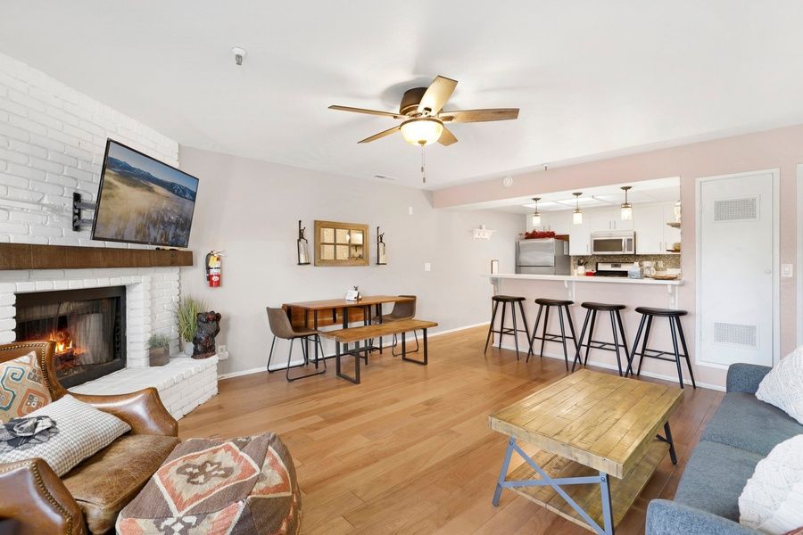 Enter your chalet on the second middle level where you are greeted with gorgeous hardwood floors and cozy furnishings- you will immediately feel like you are in the mountains here. Snuggle up on the cozy couch as you warm your toes in front of the brick gas fireplace and watch a movie on the mounted flat screen Streaming TV with complimentary hi-speed WIFI internet is provided for your convenience throughout the property. (Guests must have their own accounts to enjoy Streaming services.) The open floor plan leads seamlessly to the cute dining area and equipped kitchen where the chef of your group will find all that you need to whip up your home-cooked meals right here at the condo. The breakfast bar stools pair perfectly with the bistro-style dining table to ensure your whole group can sit comfortably together and enjoy your meals. You will love the fresh and modern kitchen stocked full of cookware and utensils along with stainless appliances and a dishwasher to ensure your cleanup is a breeze.