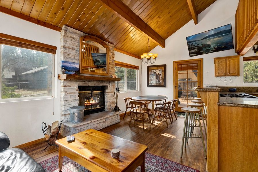Enter into the main level where you are greeted with gorgeous hardwood floors, soaring cathedral ceilings, and cozy mountain furnishings where you can sprawl out and make memories together here within your log cabin chalet. Snuggle up on the couch as you warm your toes together in front of the toasty wood burning fireplace and enjoy a movie on the mounted flat screen Streaming TV with Cable and complimentary hi speed WIFI provided for your enjoyment. (Guests must have their own accounts to enjoy Streaming Services.) The open floor plan is perfect for entertaining a dinner party or hosting your holiday feasts as you can completely stay connected together as you prepare your home cooked meals and feasts along with breakfast bar stools and a log dining table there is plenty of comfortable seating for your party here. The equipped kitchen offers all that you need for slope side snacks or family meals including tons of counter space, cookware and utensils, stainless appliances, and even a dishwasher to ensure an easy cleanup can be had when you are finished.