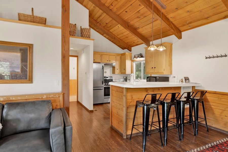 The open floor plan and vaulted open-beam ceilings are ideal for entertaining a dinner party or hosting your next family holiday in the alpine with the necessities and essentials for a wonderful visit. Big open windows allow the perfect balance of natural lighting and great views as you snuggle up on the cozy couch and warm your toes in front of a toasty wood burning fireplace and pop on a movie on the mounted flat screen Streaming TV with complimentary hi speed WIFI internet provided for your enjoyment. The formal dining table and equipped kitchen offer the chef of your group exactly what you need to whip up your home cooked meals with cookware and utensils, general appliances, and a dishwasher to ensure that your cleanup is a breeze. You will feel right at home with added laundry facilities for those wet snow clothes or extended visits, a desk to work or learn remotely, plus USB charging stations in every room which are made up for your group with warm linens, blankets, pillows, and fresh shower towels when you arrive for your visit. Outside you will find multiple levels of expansive wrapped sun decks complete with patio furnishings and a propane BBQ grill where you can grill up your freshly caught dinner from the lake. You will love heading out to the lower level deck after a fun day of adventures to soak up your fun day in your own private and secluded hot tub under the pines- this is where you will spend your evenings unwinding and relaxing. Black Oak Cabin has it all including an amazing central location with the comforts of home, charming mountain touches throughout, and bonus amenities with you in mind. Relaxation and adventure await at this beautiful cabin. Don't miss your chance for an unforgettable experience.
