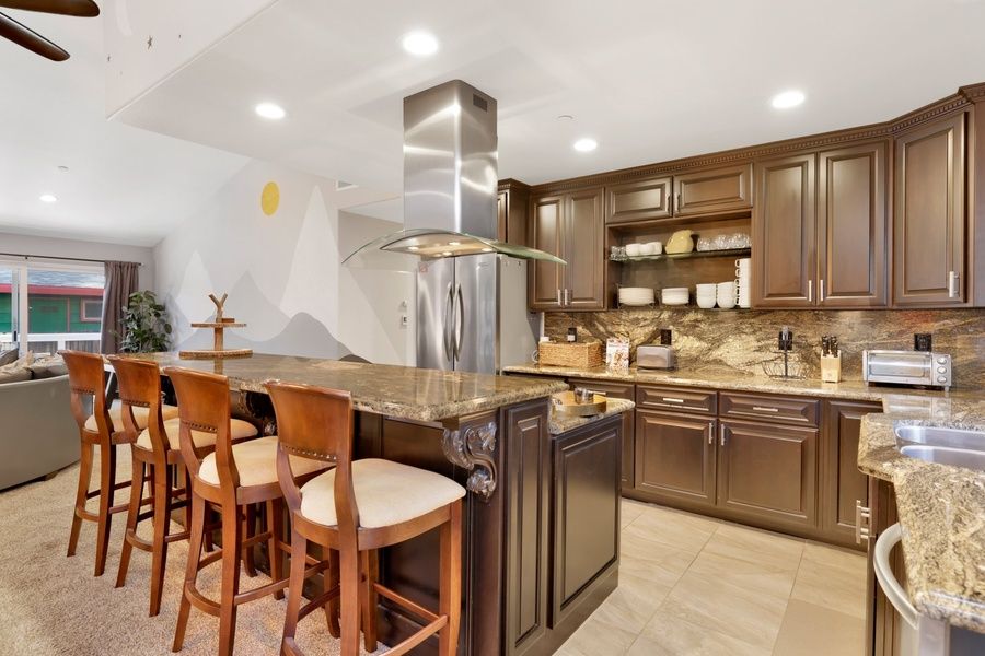 Enter into a grand family room area with vaulted cathedral ceilings, new carpet, and ultra comfortable furnishings for your group to enjoy your time together. Snuggle up on the over sized plush couch and watch a movie on the mounted flat screen TV in front of a toasty fire in the faux log gas fireplace. Take on the group at a game of foosball or shuffleboard as the open floor plan leads you right to the game room areas. The well appointed chef's kitchen offers you all that you need for your home cooked meals together. Gorgeous marble counter tops pair perfectly with the new stainless appliances and the stocked oak cabinets to provide you with all that you need. Cookware, utensils, and a dishwasher make your meals here a breeze! Breakfast bar stools pair perfectly with the massive dining table to ensure you can sit and enjoy meals together as a large group.