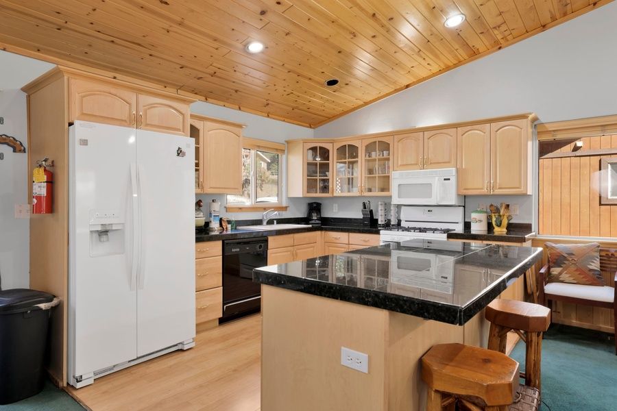 Entering the cabin you are greeted with knotty pine ceilings and an open floor plan, with comfy couch furnishings, a toasty wood burning fireplace, and complimentary hi speed WIFI and Cable are available on the mounted flat screen TV so you can snuggle up and watch the snow falling as you enjoy a movie together as you warm your toes in front of the fire. The spacious kitchen offers wood floors, marble counters, and plenty of cookware and utensils including general appliances and a dishwasher for preparing your home cooked meals.