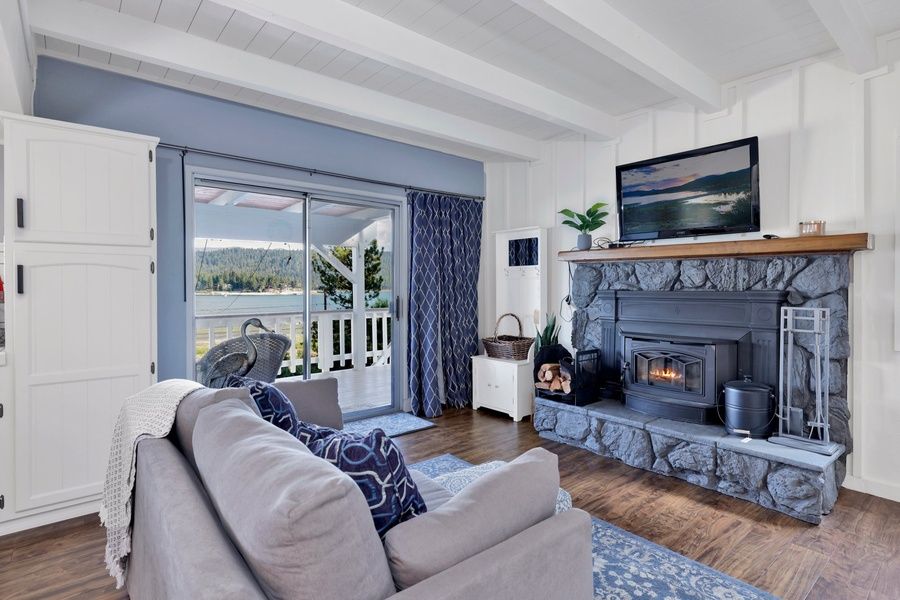 After climbing the stairs to entry-level (no garage for parking available) you will enter the first of two living rooms. Freshly furnished, the entry-level cozy living room area offers sitting arrangements set perfectly in front of the toasty wood-burning fireplace providing your group a great spot to hang out. Enjoy a movie on the streaming TV while watching the boaters on the water with complimentary high-speed WIFI provided. (Guests must have their own accounts to enjoy Streaming services.) With ample seating for your group meals at the log dining table, you can't beat the soaring windows and spectacular lake and mountain views while you dine together. The chef's kitchen has all that you need to whip up your home-cooked meals. The cabinets are stocked with utensils and cookware. General appliances and even a dishwasher for your convenience ensure that your meal preparations here are a breeze, and the views, while you cook, can't be beat!
