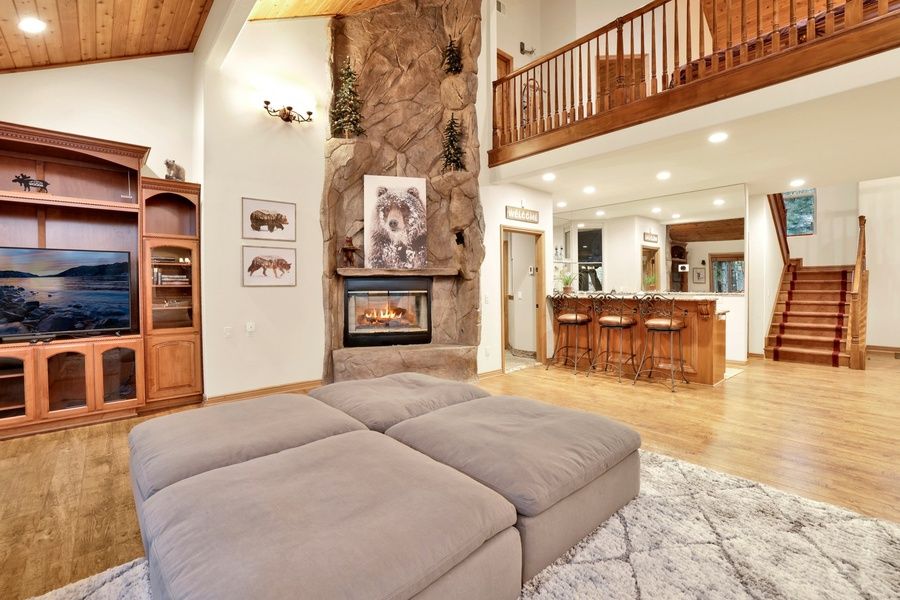 Occupancy: 10 Adults | 6 Children- Total Occupancy: 16 People Max- Parking: 4 Vehicles Max- Driveway- No Garage No Over Occupancy. No Parties. No Street Parking. 4X4/Chains REQUIRED In Winter City of Big Bear "Good Neighbor Policy" Enforced At All Times- NO PETS ALLOWED- Fines Imposed For Pets Found On Premises Welcome to The Spa at Winterset, one of Big Bear's finest custom luxury homes located in the prestigious Heavenly Estates––within walking distance of Snow Summit and a five-minute drive to Bear Mountain! This custom home is an entertainer's dream that pulls out all the stops. Not only is it walking distance to Summit, but it has its own resort-level grotto with a jacuzzi, steam shower, sauna, fireplace, and wet bar! Whether you're relaxing after a day of skiing, mountain biking, or boating, you will find it hard to leave the spa when it's connected to your house! The Spa at Winterset is designed for large parties to come together without feeling crowded. With vaulted ceilings, an open floorplan, large communal gathering spaces, four bedrooms, and five bathrooms, your group can come together for fun during the day, and retreat to their private living quarters in the evening. All three master bedrooms include private bathrooms with a jacuzzi tub and king-sized bed. The fourth bedroom also includes a king-sized bed and an attached half bath. Regarded as one of the nicest areas of Big Bear, Heavenly Estates provides the ideal location for unparalleled access to skiing, restaurants, and main shopping centers. This quiet, neighborhood-like home is tucked away from the busy Big Bear Blvd traffic. The flat topography with almost no cars invites you to walk amongst the pines morning, noon, and night––with coffee or wine in hand. No need to bother with cars, chains, or car seats when everything is within walking distance. The downstairs living room is an entertainment wonderland with a massive cloud couch with ottomans at every seat––it's basically a giant human dog bed! There's no sitting on this couch––it demands full lounging with no feet touching the floor. Relax all day watching movies or sports on the large flat screen smart TV with complimentary Netflix, Hulu, and Disney+. The expansive gourmet kitchen and dining area flow seamlessly into the living room with a breakfast bar in between, creating a cozy great room feel. With an extended farmhouse dining table for eight and a breakfast bar for four, there's ample room for daily dining and evening game nights. The spacious and thoughtful layout of this kitchen affords enough room so no one's bumping elbows. And don't worry, everything you need to cook is already there from pots and pans to baking dishes and flatware. Some fun gadgets like a crock pot and blender are also available. There's also a covered back deck adorned with café lights off the dining room with a table for eight with a grill and Traeger smoker for outdoor entertaining. The wet bar is connected to the living room and the grotto through a fun pop-up window for in-spa ordering. With a bar sink, wine fridge, cocktail shaker, shot glasses, and beer steins, you have everything you need for custom orders. Whether you're lounging on the couch or catching bubbles in the spa, you never have to move! Just place your order with your bartender friend. The upstairs loft level above the living room comes complete with a pool table, two small bar TVs for game watching, and a remote working station to hammer out some quick Zoom calls so you don't have to take PTO for the day. Both upstairs bedroom suites meet in the middle at the pool table. The Multi-family room on the right is designed for hanging out with bean bags, smart TV, Nintendo, kids playroom, and two triple bunks for maximum sleeping space. The playroom is nothing shy of a toy store! Literally, drop your suitcases at the door and watch the kids disappear! From race cars, army men, and drones to barbies, a play kitchen, and puzzles––you won't hear, “I'm bored,” until you hit the road home. And good luck with the, “Are we there yets” :) The master suite to the left has a king bed, fireplace, and private bathroom with spa tub and shower. The downstairs master suite also has a king bed, fireplace, and across the hall is a giant mud room, an extra-large washer & dryer set, great for those who need to do laundry after a day at the slopes, hiking, or the lake. The garage has been converted into a massive bonus room with eight full-reclining theater chairs and a 10' foot projector screen, candy wall, popcorn machine, ping pong table, foosball table, reclining couch, and more! The backyard is a rare find in Big Bear. It's fenced, flat, and turfed––boasting a brand new basketball court, horseshoe pit, and cornhole. Not to mention other fun games including bocce ball, ladder ball, spike ball, and more! The back covered patio is perfectly designed for gathering within the fenced yard to keep your little ones safe while that build snowmen. The large pull-through driveway provides all the off-street parking you could want without the added stress of a steep icy driveway during the winter. The property is also on the corner with one vacant lot and only one neighboring home, giving you lots of privacy and little noise. The yard is full of towering pines and maple trees, making the "backyard" feel like your own private woodsy retreat. D Bedroom 1: King Bed, Smart TV, Private Bath w/ Jetted Spa Tub + Shower- Downstairs Entry Level Bedroom 2: King Bed, Downstairs Entry Level Bedroom 3: King Bed, Smart TV, Fireplace, Private Bath w/ Jetted Spa Tub + Shower- Upstairs 2nd Level Bedroom 4: Two Twin/Full Bunks + Two Twin Beds, Smart TV, Fireplace, Private Bath w/ Jetted Spa Tub + Shower- Upstairs 2nd Level Hallway 3/4 Bath in Hot Tub/Sauna room- Downstairs Entry Level Private Bath w/ Jetted Spa Tub + Shower- Bedroom 1- Downstairs Entry Level Private Bath w/ Jetted Spa Tub + Shower- Bedroom 3- Upstairs 2nd Level Pri