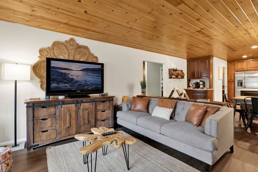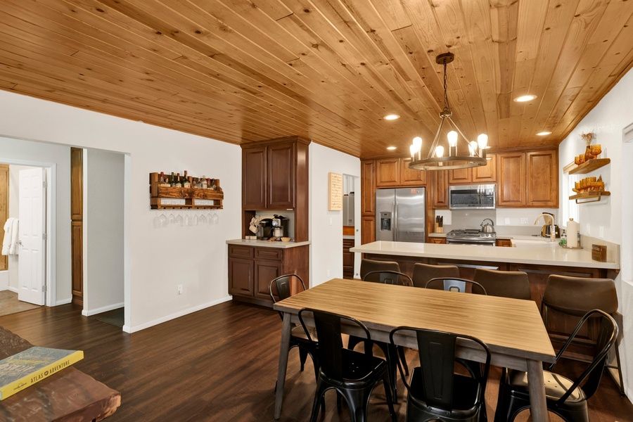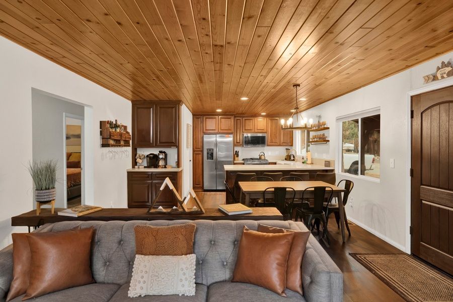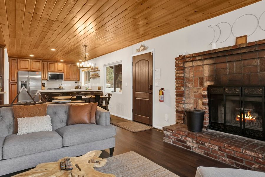 Enter your home in the cozy and warm living room where you are greeted with beautiful hardwood floors, knotty pine ceilings, and big open windows that provide the perfect balance of natural lighting and forest views of the cute neighborhood outside. Snuggle up on the cozy couches as you warm your toes together in front of the toasty wood burning fireplace and pop on a movie on the flat screen Streaming TV with complimentary hi speed WIFI internet provided for your enjoyment. (Guests must have their own accounts to enjoy Streaming Services.) The open floor plan is perfect for entertaining a dinner party or hosting your next family holiday in the mountains as it leads seamlessly to the equipped dining area and kitchen where you will find plenty of sitting space for your meals together between the breakfast bar stools and sitting table. The cute kitchen offers oak cabinets stocked with cookware and utensils along with stainless appliances and a dishwasher for a quick and easy cleanup.