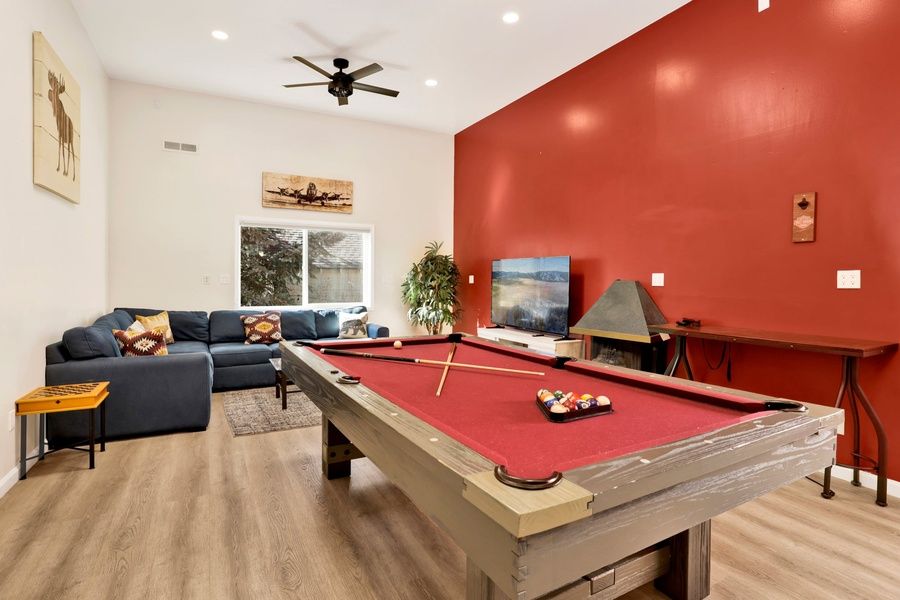 Enjoy a movie night in the theater with the group or head downstairs to find the world's best game room ever- boasting so many packed amenities you will never want to leave the cabin while you are here! Additional sitting couches paired with a pool table and foosball are available plus Air hockey, arcade games, and even a dunk basketball game are sure to keep your whole group entertained. Five spacious bedrooms and three full bathrooms provide ample space for any group, all are made up for your visit with warm linens, blankets, and fresh shower towels. Venturing outside you will find ample redwood decks and a gorgeous manicured property provide a wonderful outdoor space for you to enjoy a BBQ on the patio or take a soak after a day on the slopes in your own private hot tub under the stars.