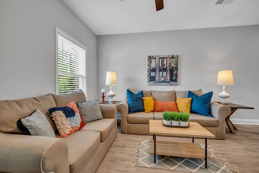 Our private, 2 bedroom, 2.5 bathroom space comes equipped with a full kitchen to make home-cooked meals for friends and loved ones. Stream your favorite shows or movies on our large screen TVs in the living room. Take your dog for some fresh air in our convenient sub-division dog park/run located with 50 ft of your door. Stay organized and avoid the cost of a laundromat by using our in-unit washer/dryer.
