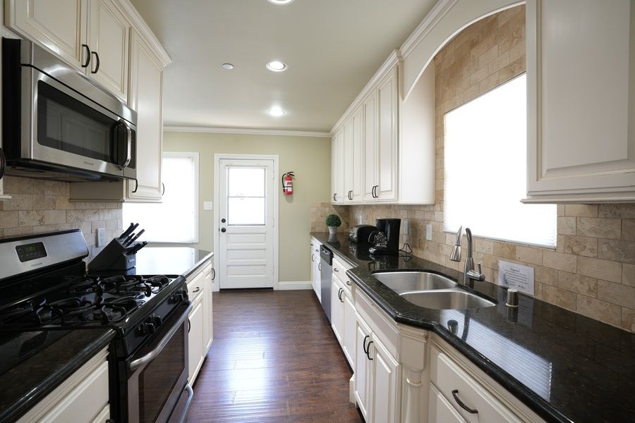 Upgraded kitchen with custom panel cabinetry, upgraded hardware, travertine backsplash, and stainless steel appliances: stove/oven, refrigerator, microwave, and dishwasher. Spacious living and dining room off of the kitchen. Main Living Room has a TV with DVD Player. Hi-Speed Wireless Internet is included. Central heating and air conditioning.
